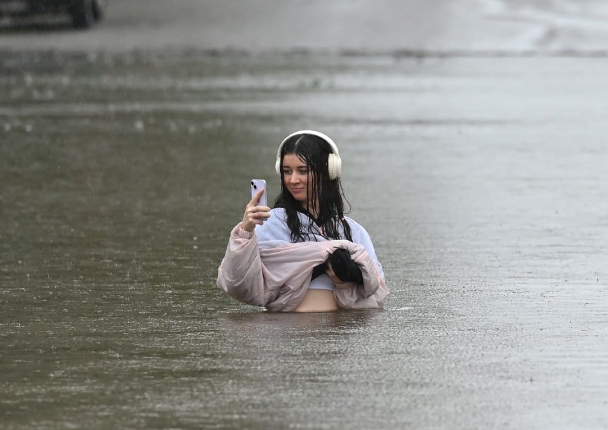 Some people piled onto this girl for being irresponsible, claiming that submerged hazards or flows could have gotten her (and anyone trying to help her) into difficulty. But I think this is a version of climate resilience: to bear witness, wade into the situation, and say, 'I was here.' The water looks still. So what if she gets some likes and social clout while she's at it?